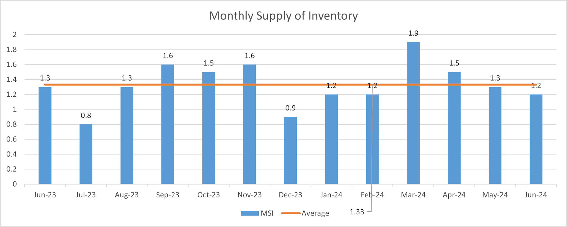 When we look at the data for Days on Market (DOM) and Monthly Supply of Inventory (MSI) next to each other like this, we clearly see how they relate to one another. If a bar goes up one month on the DOM chart, it goes down that month on the MSI chart, and vice versa. This is the trend we expect to see. If we saw an increase in DOM along with a higher MSI month-over-month, that would be an indication of a change towards a buyer's market.